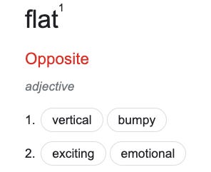 So yeah, I’m flat and Situation Normal, a funny newsletter that just turned three, is marking the occasion with an unfunny post. I want to say that’s a good thing, but you wouldn’t believe that because I don’t believe it. But I can’t quite bring myself to say that’s a bad thing either, because life isn’t as black and white as flat and whatever the opposite of flat is.