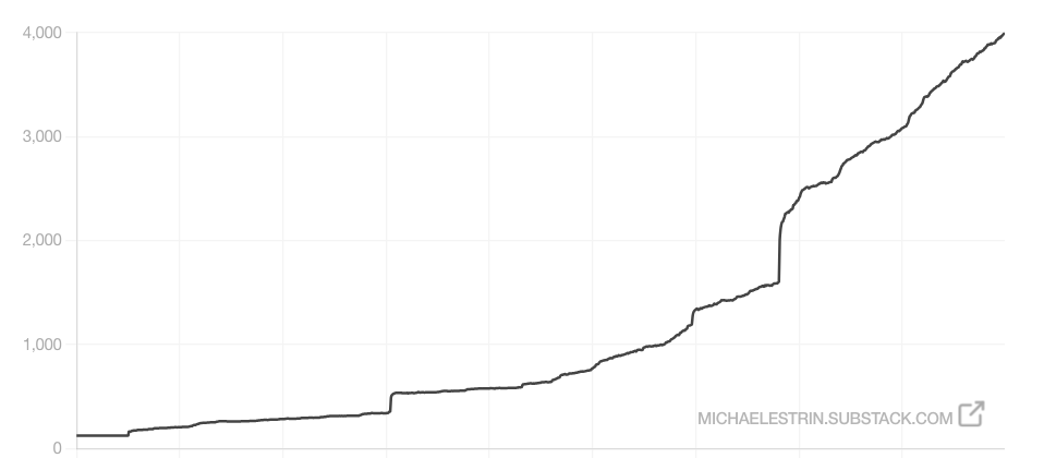 While I have you, it’s a good time to tell you about a milestone. I launched Situation Normal three years ago, almost to the day. When I began this project, I had about 125 subscribers. Today, there are roughly 4,000 of you.
