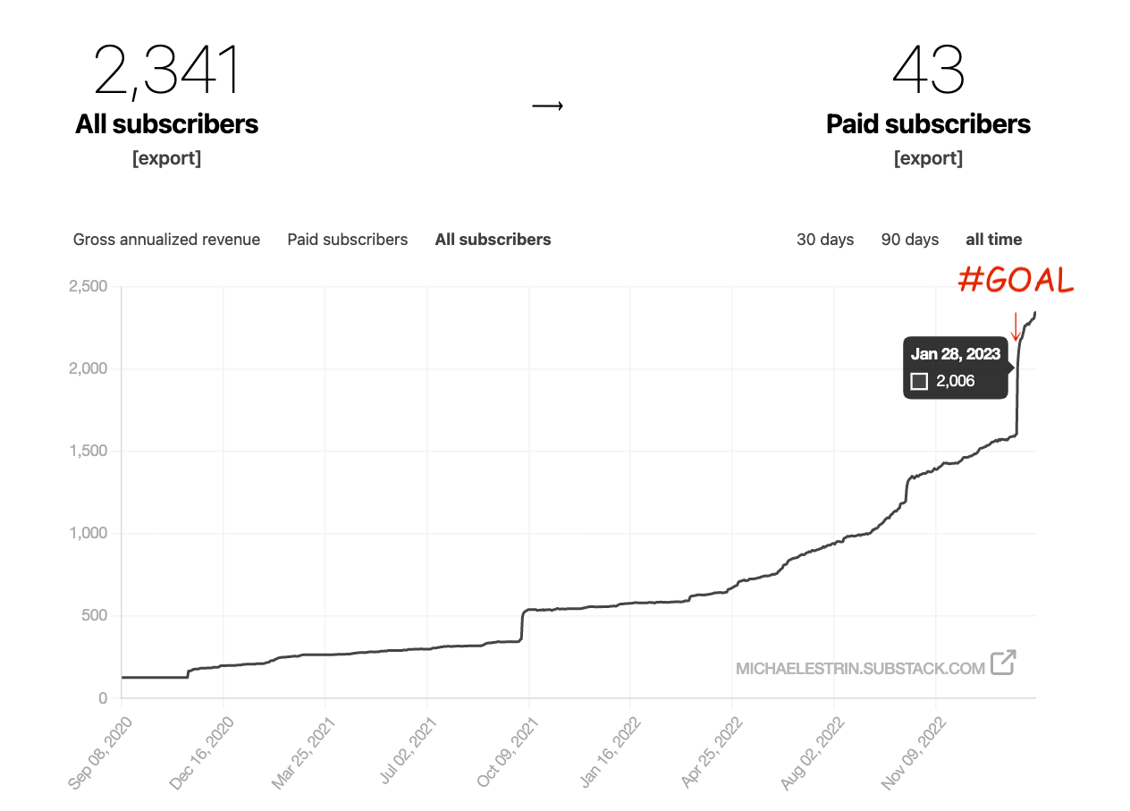 Since I made this list in the beginning of January, I figured these would be my goals for most of 2023. But as it turned out, I hit the first goal—2,000 free subscribers—less than a month into the year, and then I kept going goaling!