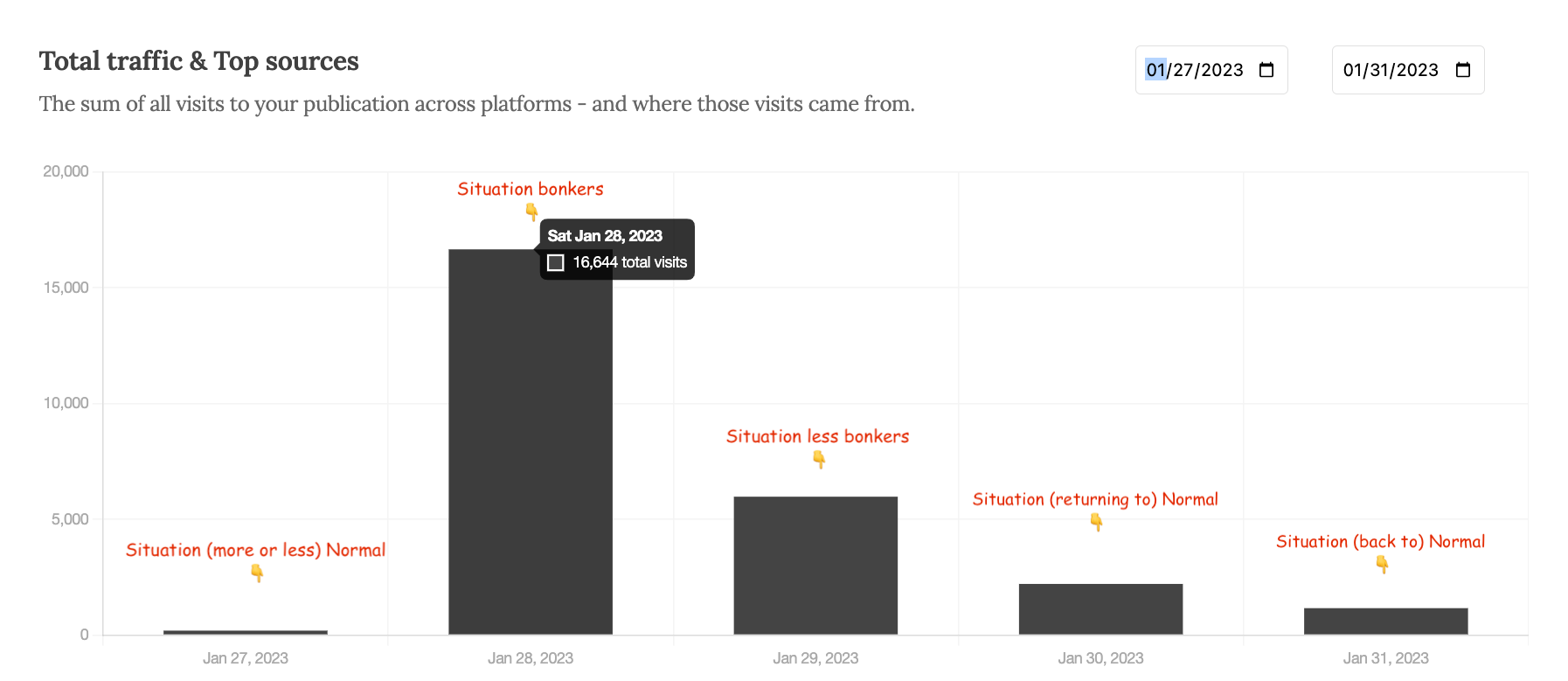 For context, I’m going to share a screenshot of the traffic spike I saw when I went viral. Typically, my traffic on days that I post is around 2,500 views. On days that I don’t post, my traffic hovers around 400 views. On the day I went viral, I had 16,644 views.