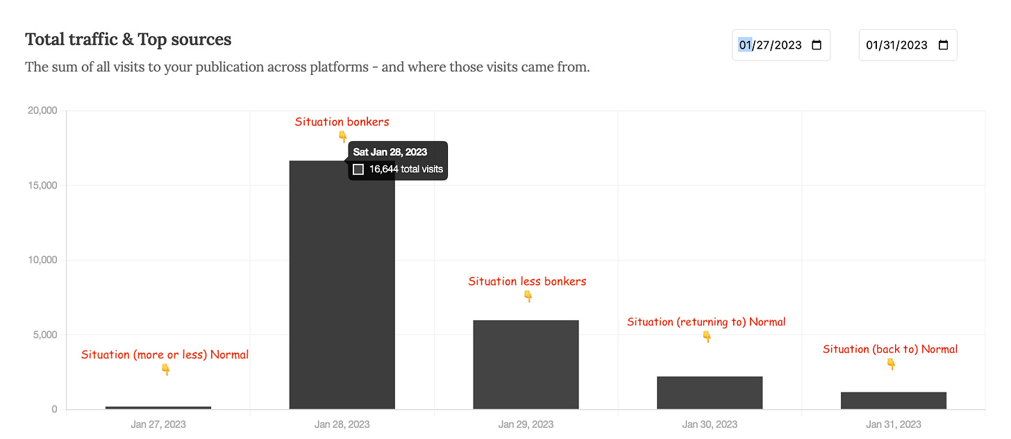 Normally, I add a few subscribers per day. One or two new people, or even a dozen new people, aren’t going to be able to pull off a vibe shift in a room of 1,600 people. To paraphrase Walter Sobchak, one or two people showing up in a room of 1,600 have no frame of reference because they are like children wondering into the middle of a movie…