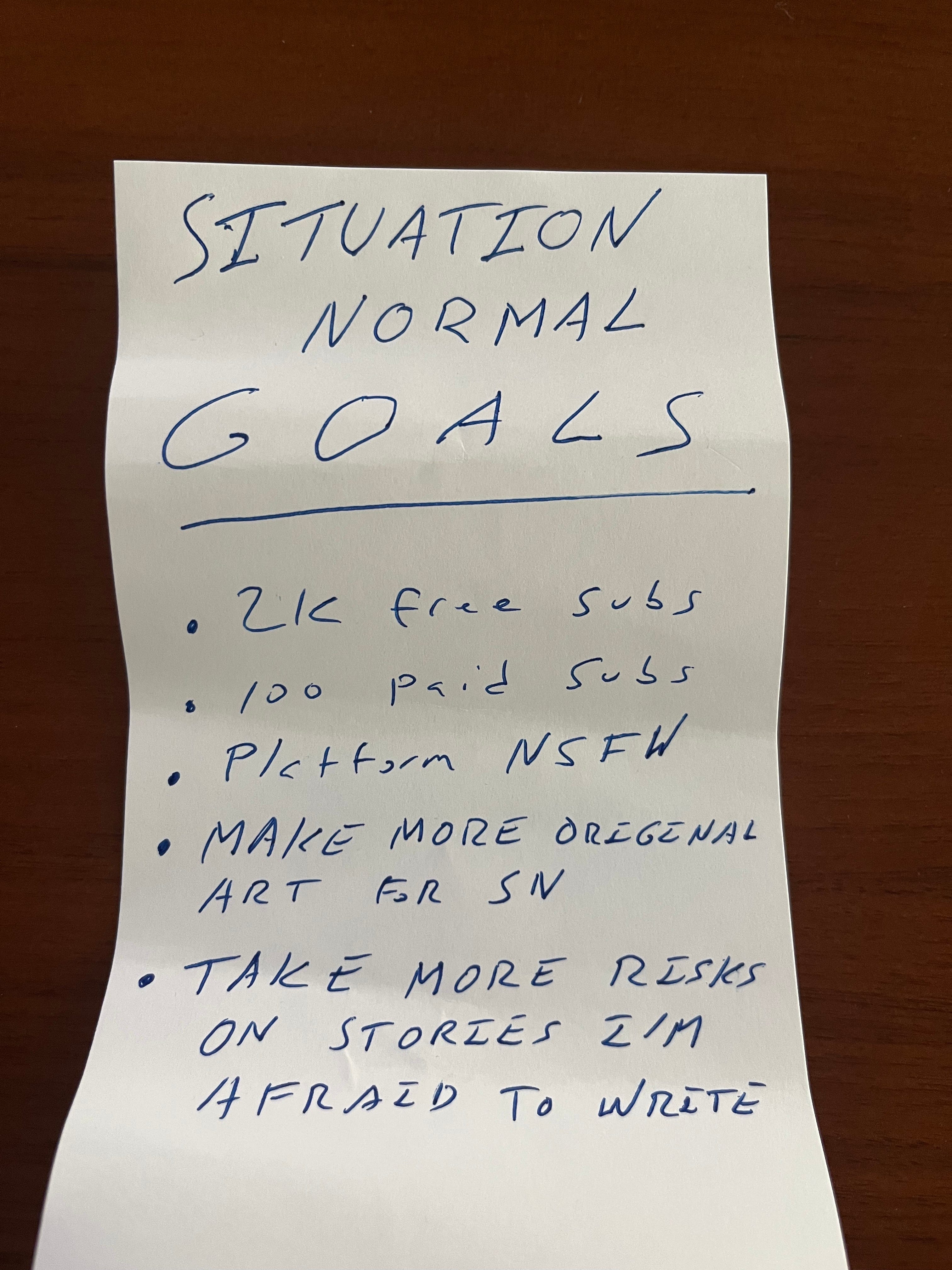 At the start of 2023, I made a list of goals for Situation Normal. I never used to do this kind of stuff because I used to think that setting goals was for people who were trying a little too hard to “crush it,” without realizing that you should only use a phrase like “crush it” ironically.
