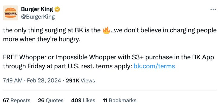 By the time lunch rolled around, the Wendy’s story had shifted. Wendy’s was back-peddling. Sort of. The Wendy’s comms team insisted that they’d never used the term “surge pricing.” That was true! But the source of the story had been this statement from the Wendy’s CEO: