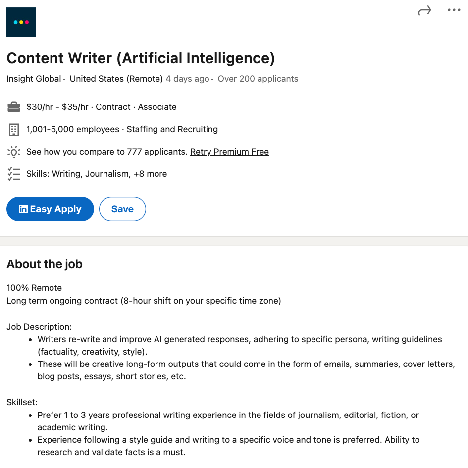 I’m a writer, not a computer scientist, so maybe my thoughts about AI aren’t all that sophisticated. But it turns out, AI needs me a lot more than I need AI, at least according to this job posting I found on LinkedIn.