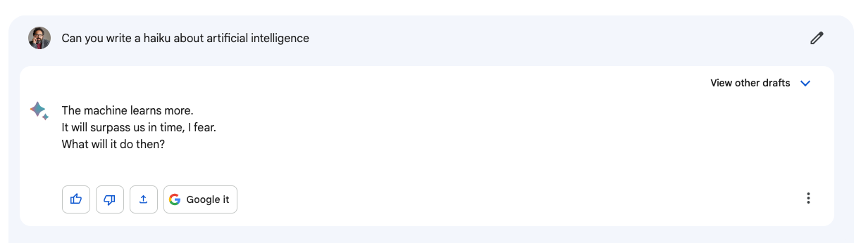 A large language model—even one that learns fast and breaks everything—isn’t human, and whatever it has to say about the human condition is bullshit. Actually, it’s more like a mirror image of bullshit. Because the AI doesn’t know anything, and it doesn’t feel anything, either. What the AI does is spot patterns, assemble reasonably convincing facsimiles of thought, and above all, reflect you back to you. To wit: I asked Bard, Google’s AI, to write me a haiku about AI. Here’s what Bard “wrote”: